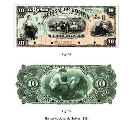 No se conocen piezas del billete de 10 Bolivianos (fig. 24) que hayan circulado más que el Specimen de la presente colección. En el anverso se ve una escena andina flanqueada por dos alegorías a la abundancia, mientras que el reverso (fig. 25) muestra una mujer dando agua a un águila, que se confunde con el cóndor. El corte de 50 Bolivianos circuló por muy poco tiempo, siendo éste muy raro hoy en día (fig. 26). Se aprecian en estos billetes más de las alegorías típicas de la época y se introduce, por primera vez, una alegoría masculina. El reverso lleva la representación de una mujer oriental, con una lámpara de aceite (fig. 27).
