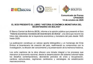 El Banco Central de Bolivia (BCB), informa a la opinión pública que presentó el libro “Historia económica monetaria del bicentenario de Bolivia”, una obra que recorre los hitos más relevantes de la trayectoria económica y monetaria del país desde 1825 hasta 2025.