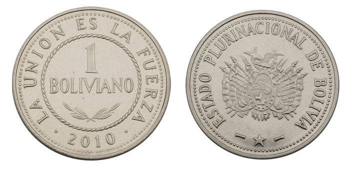Círculo externo: En la parte superior de la moneda la inscripción “ESTADO PLURINACIONAL DE BOLIVIA”.