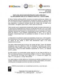 El Banco Central de Bolivia (BCB) comunica a la opinión pública que, debido a la gran demanda del Bono BCB Bicentenario se determinó ampliar su vigencia hasta el 31 de octubre de 2025, manteniendo las mismas condiciones financieras. Con esta disposición, la población boliviana tendrá dos meses más (el plazo inicial vencía este 31 de agosto) para invertir y hacer crecer sus ahorros.