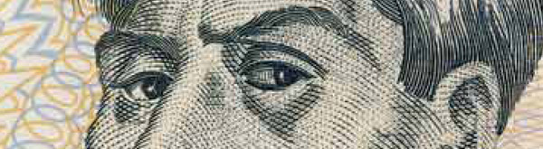 • Dos líneas verticales, una verde a la izquierda del personaje de pie y otra violeta a la derecha del rostro, con el texto "BANCO DE LA REPÚBLICA".